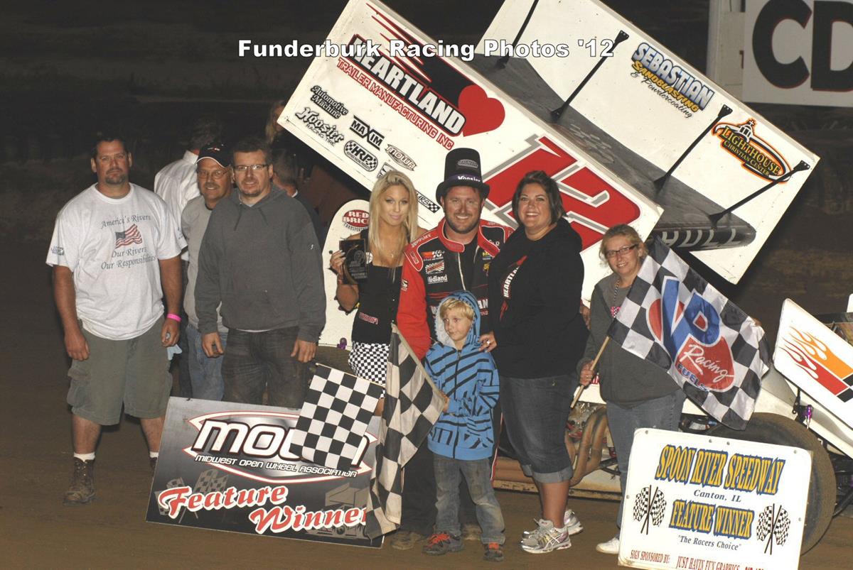 (Bill W) September 15, 2012 – Jerrod Hull won a high speed game of chicken coming for the checkered flag to edge Don Droud Jr. by four hundredths of a second to win Saturday’s 28th Annual Tom Knowles Memorial at the Spoon River Speedway near Canton, Illinois. It was the second year in a row that the defending MOWA champion and current point leader has won the event.