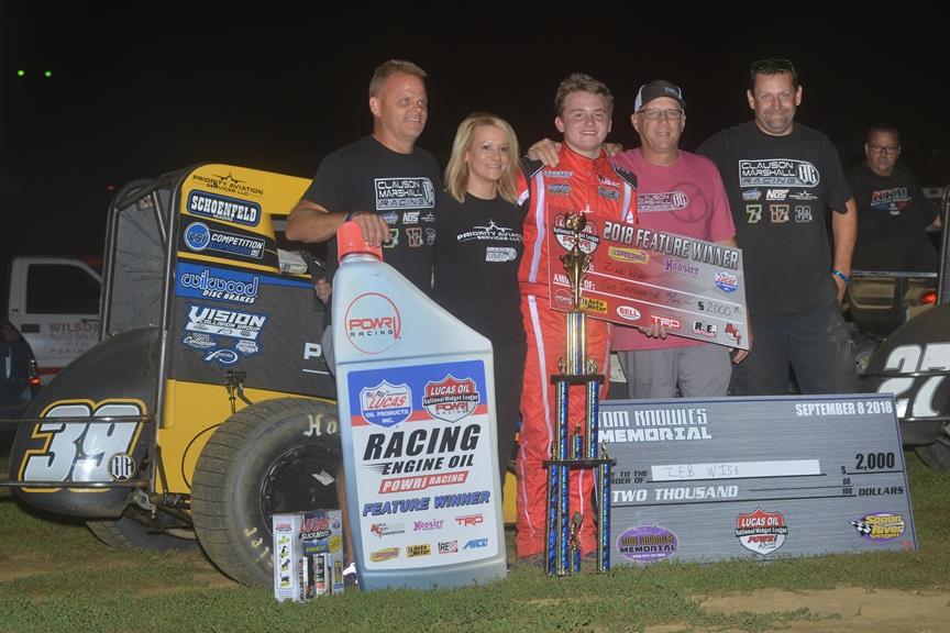 Lewistown, IL – Zeb Wise of Angola, Indiana picked up his first career POWRi Lucas Oil National Midget League Saturday night at Spoon River Speedway. Wise used a unique line on the high-banked 3/8 mile Spoon River Speedway to etch his name in the history books as the winner of the 32nd annual Tom Knowles Memorial.